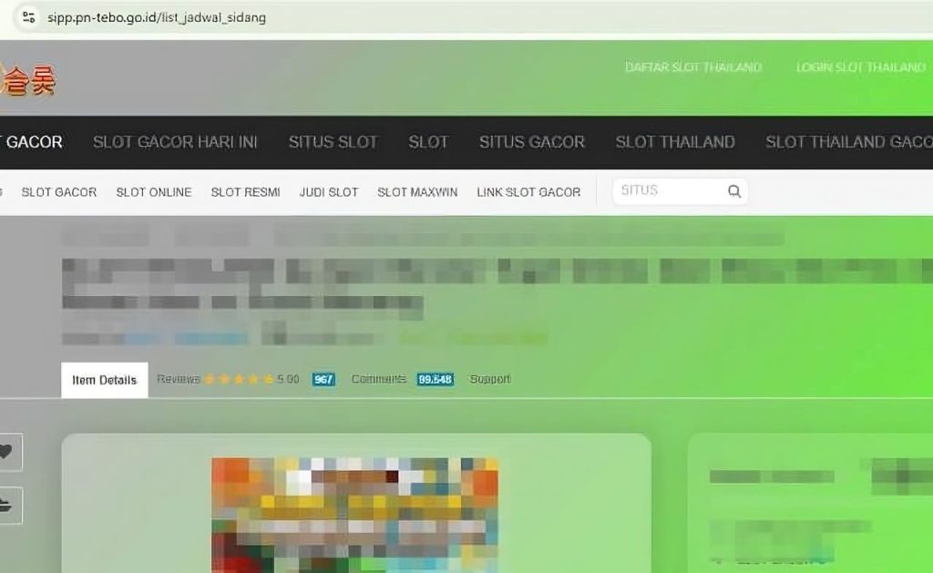sekitarjambi.com – Website Pengadilan Negeri (PN) Kabupaten Tebo, Provinsi Jambi, berubah menjadi laman website judi online pada Kamis (9/10/2025). Laman website PN Tebo yang beralamat https://sipp.pn-tebo.go.id/ biasanya menampilkan jadwal sidang di wilayah Kabupaten Tebo. Namun saat diakses, laman website tersebut menampilkan judi online slot Thailand.
