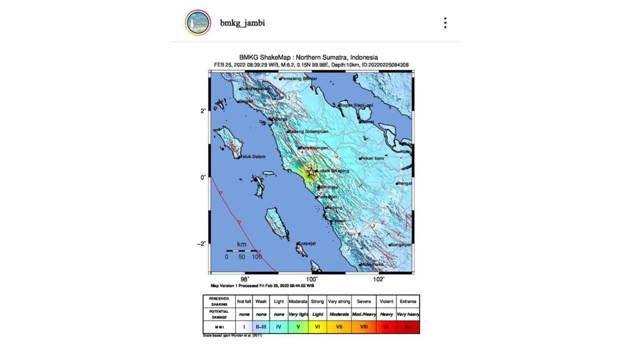 sekitarjambi.com – Jambi, Melalui akun instagramnya yakni @bmkg_jambi, Badan Meteorologi, Klimatologi, dan Geofisika (BMKG) Jambi mengabarkan bahwa gempa berkekuatan 6,4 SR mengguncang wilayah Kabupaten Pasaman Barat, Sumatera Barat (SUMBAR) pada Jumat (25/2/2022) sekira pukul 08.39 WIB.