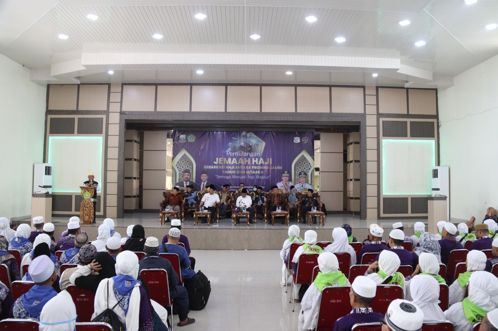Dalam acara seremonial tersebut, Ketua KLOTER BTH 24 Provinsi Jambi, H. Aries Sepda Loethfi Ahmad, melaporkan bahwa jumlah jemaah yang kembali ke Tanah Air yakni sebanyak 447 orang, terdiri dari 189 jemaah laki-laki dan 258 jemaah Perempuan.