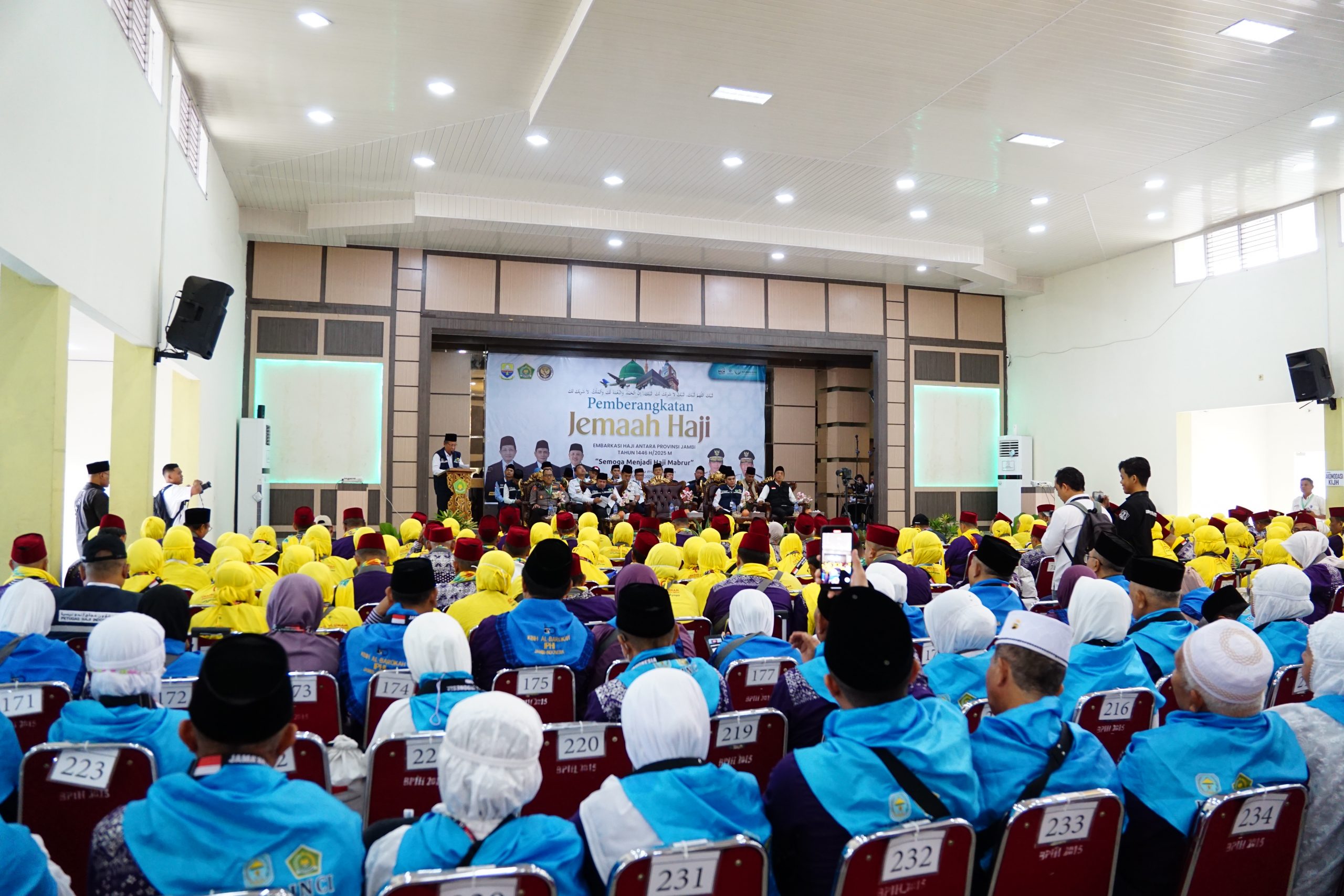 Pada prosesi pelepasan jemaah yang berlangsung khidmat, dihadiri oleh Wakil Gubernur Jambi Drs. H. Abdullah Sani, M.Pd.I., Kepala Kantor Wilayah (KANWIL) Kementerian Agama (KEMENAG) Provinsi Jambi Dr. H. Mahbub Daryanto, M.Pd.I., Kepala Bidang Penyelenggaraan Haji dan Umrah (PHU) KANWIL KEMENAG Provinsi Jambi, Asisten I Bidang Pemerintahan dan Kemasyarakatan Setda Provinsi Jambi Arif Munandar, KABAGBINOPS POLDA Jambi AKBP Heru Hidayat, perwakilan pemerintah daerah Kabupaten Kerinci, Kabupaten Muaro Jambi dan Kota Jambi, para unsur FORKOPIMDA dan Pejabat Eselon III lingkup KANWIL KEMENAG Provinsi Jambi.